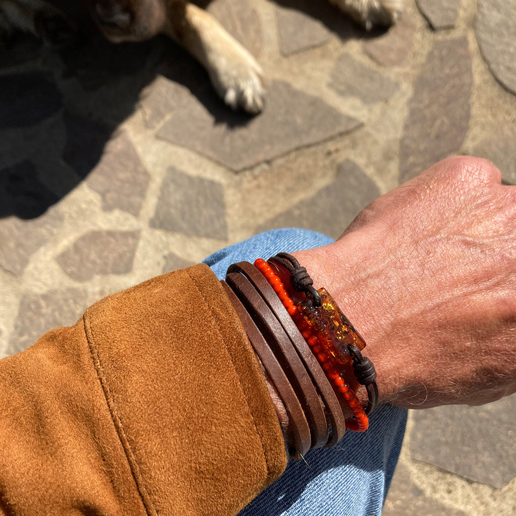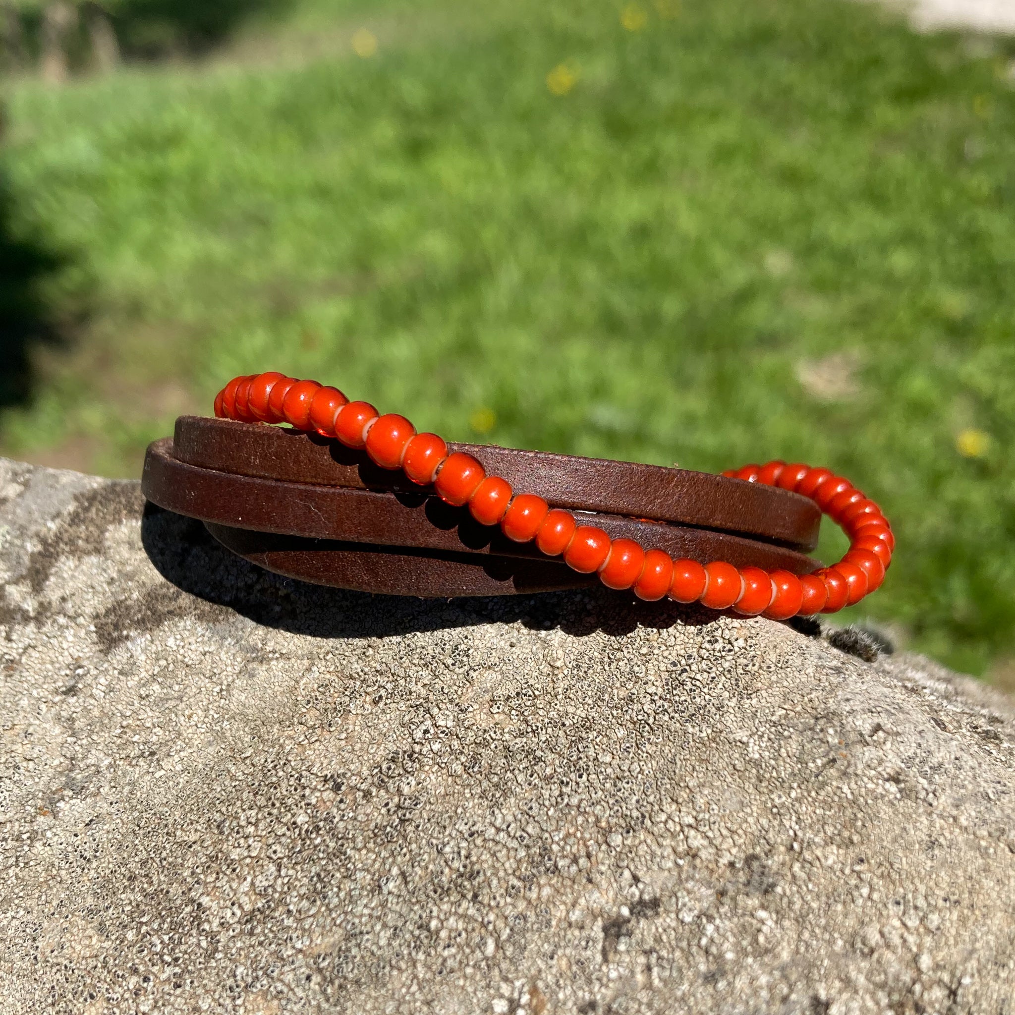 We chose these lustrous vintage Venetian white-heart trade beads to create a special limited edition Accent bracelet because of their rich colour, history and depth of meaning. Trade beads echo the power of human connection having been passed hand to hand across generations and cultures. Rich in texture and symbolism, they bring warmth and brightness to your wrist, and pair beautifully with our darker tribal leathers and earthy tones. A subtle spark of colour that will keep you energised and cheerful every time you look at them.