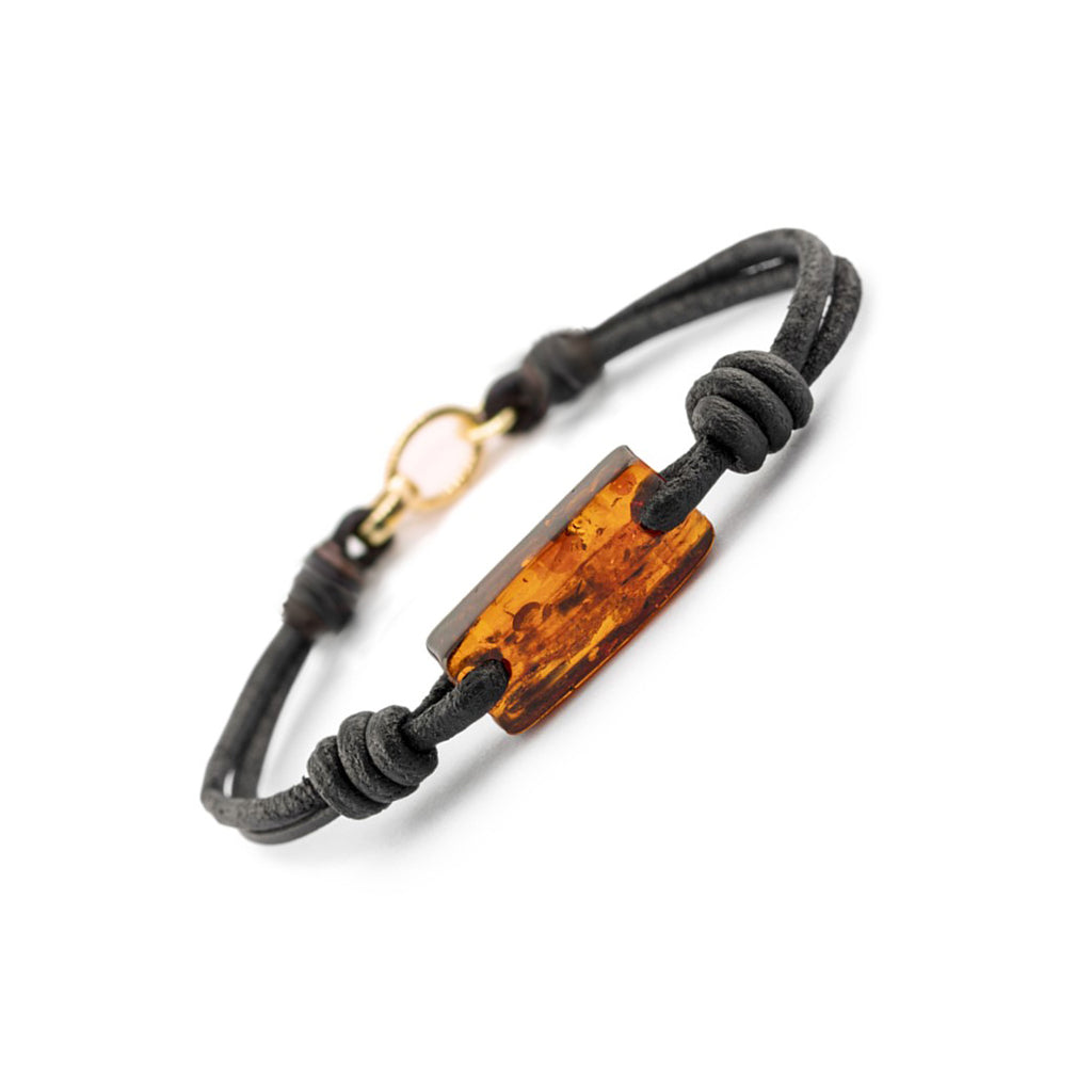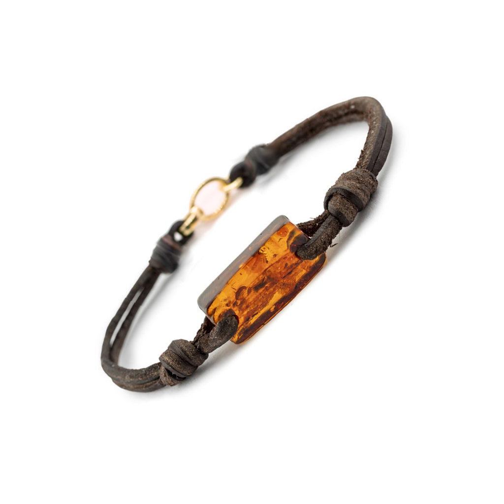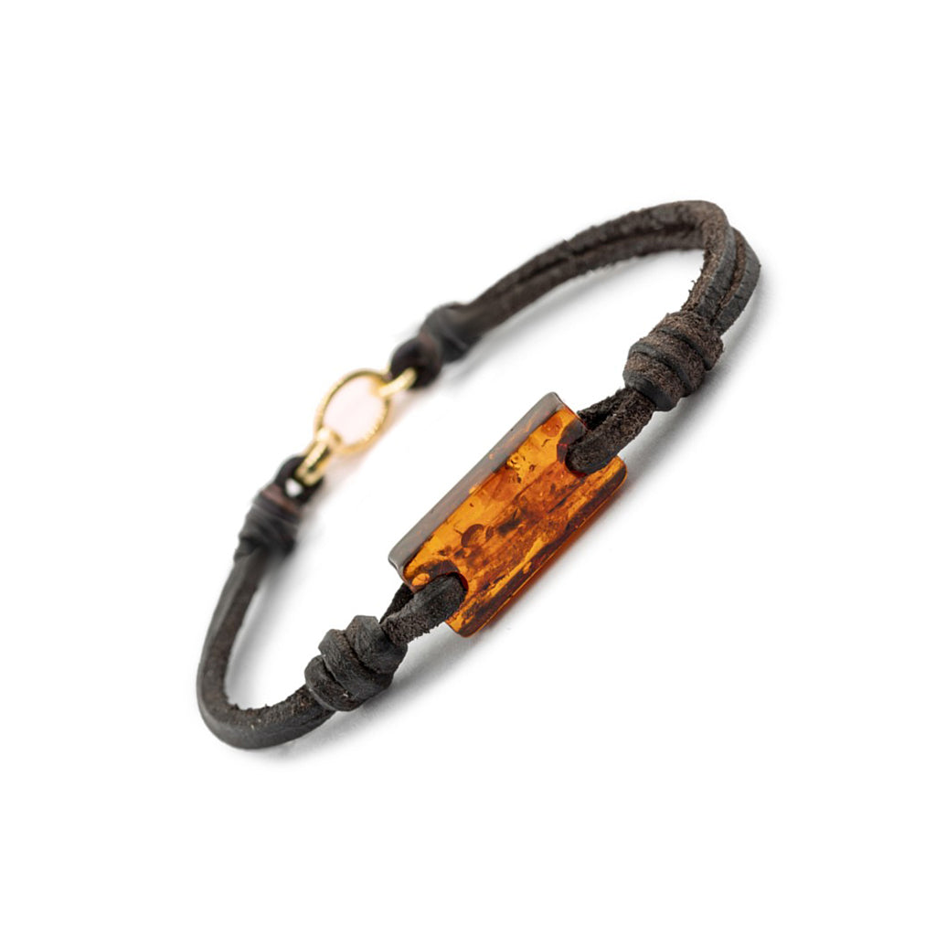 Dark brown Baltic amber and leather. Clasp in recycled sterling silver or 14k recycled gold – This product can be worn with a selection of leathers. See our Materials & Meaning and Product Care section for more information.