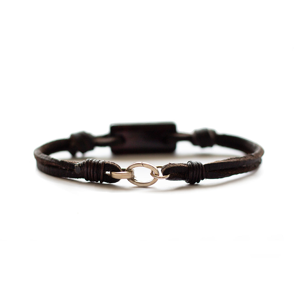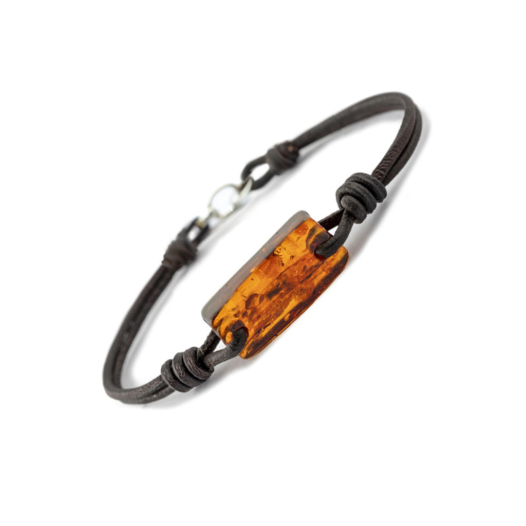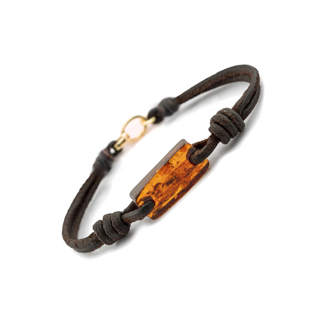 Dark brown Baltic amber and leather. Clasp in recycled sterling silver or 14k recycled gold – This product can be worn with a selection of leathers. See our Materials & Meaning and Product Care section for more information.