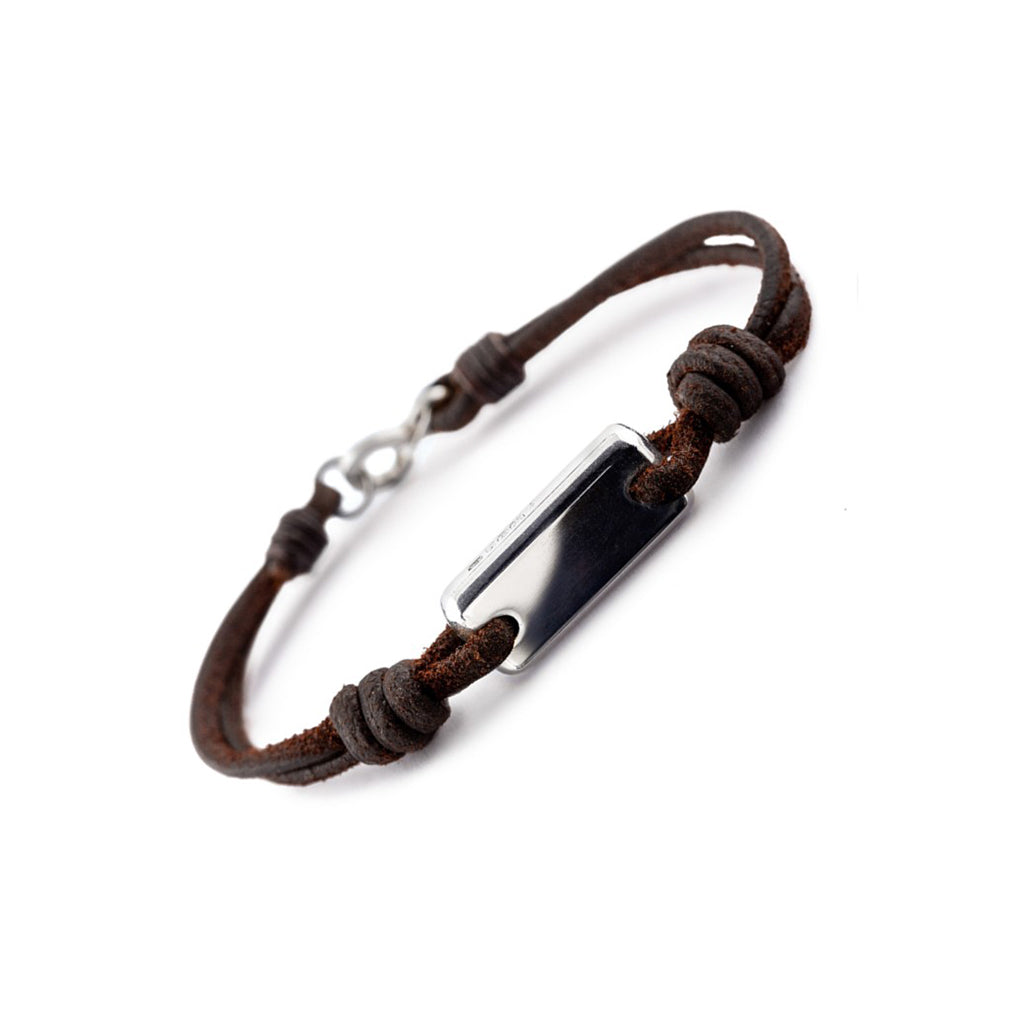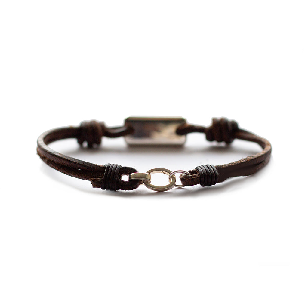 Recycled sterling silver ingot and dark Havana English leather. Clasp in recycled sterling silver.