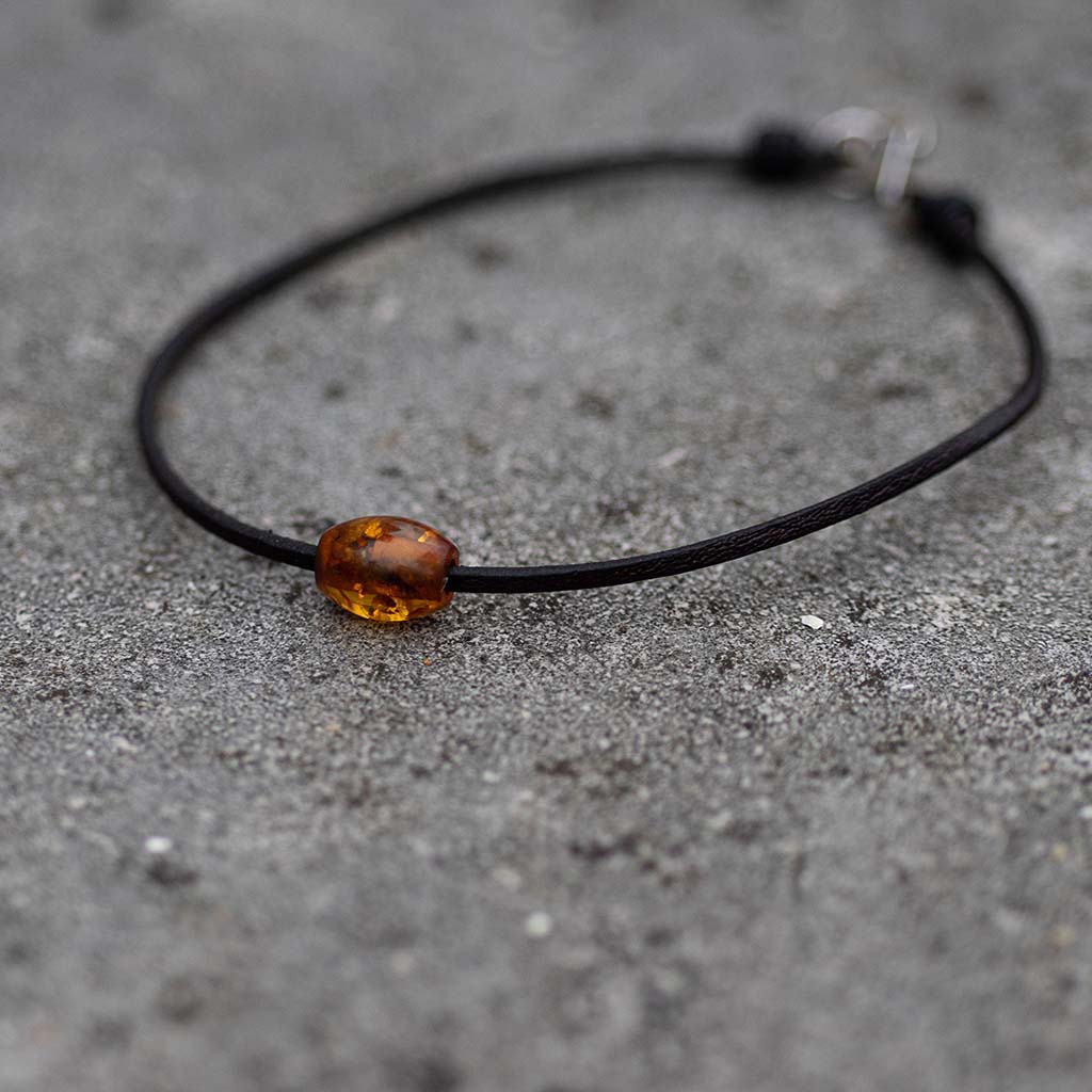 Brown Baltic amber on kangaroo strap. Clasp in recycled sterling silver.