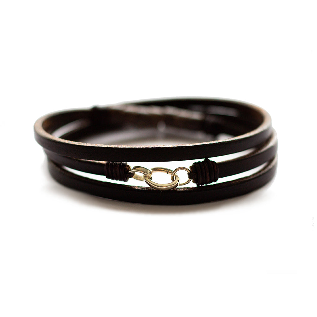 Vintage black snake vertebrae beads (made from glass) and dark Havana English bridle leather. See our Materials & Meaning and Product Care section for more information. Clasp in recycled sterling silver or 14k recycled gold.