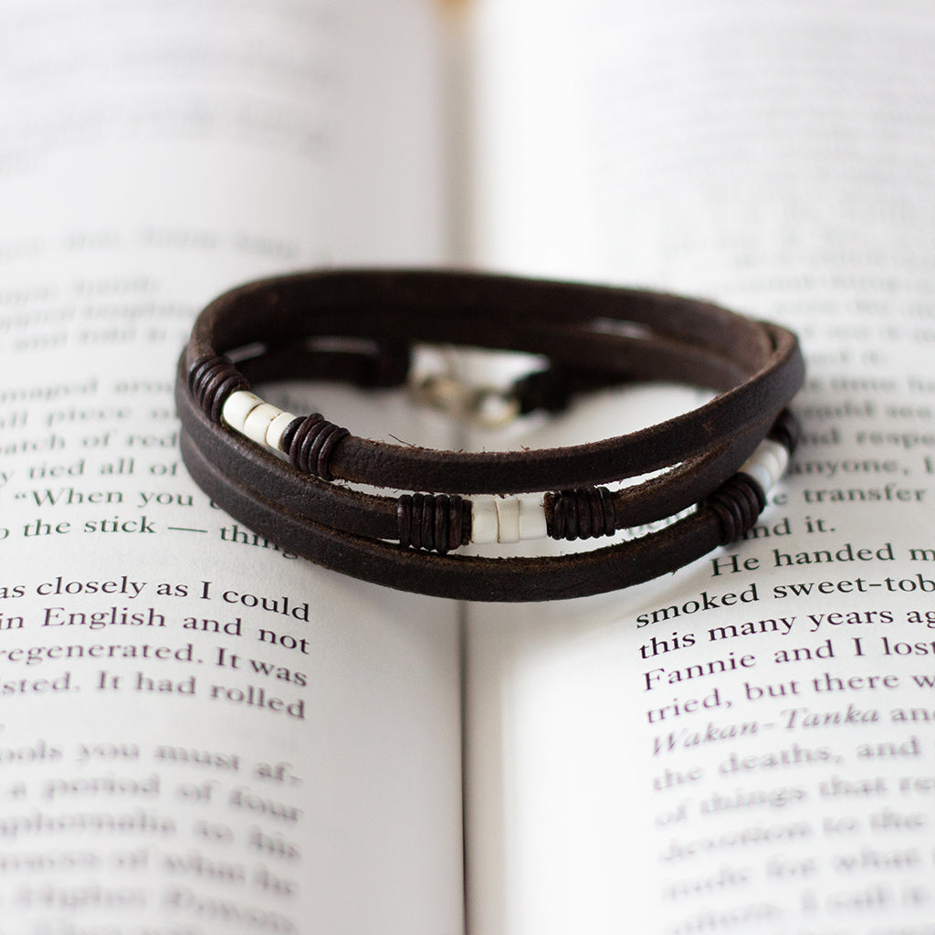 Vintage white goomba trade beads and American bison leather. We love the tactile nature and calming look and feel of the goomba trade beads. They look like each one was lovingly hand polished and their character derives from passing hand to hand over the centuries. Each bead has been made smooth by touch, like the curve in an ancient stone stair or a river stone made smooth by time.